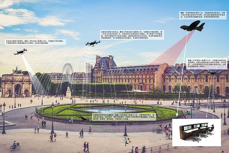 在防區(qū)群眾疏散過(guò)程中,鷹眼一號(hào)偵察型固定翼無(wú)人機(jī),可搭載視頻偵察設(shè)備,對(duì)整個(gè)防區(qū)實(shí)施大面積空中偵察,實(shí)時(shí)監(jiān)控疏散現(xiàn)場(chǎng)的全局動(dòng)態(tài),為后臺(tái)指揮決策提供全面、宏觀的現(xiàn)場(chǎng)情報(bào)支撐;鷹眼二號(hào)系留型六旋翼無(wú)人機(jī),可搭載系留模塊和偵察模塊,對(duì)重點(diǎn)區(qū)域?qū)嵤?60度的長(zhǎng)時(shí)間、定點(diǎn)監(jiān)控;上述偵察視頻均可實(shí)時(shí)傳輸至指揮中心,為指揮決策提供第一手素材。